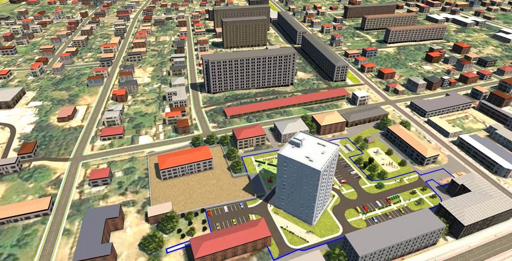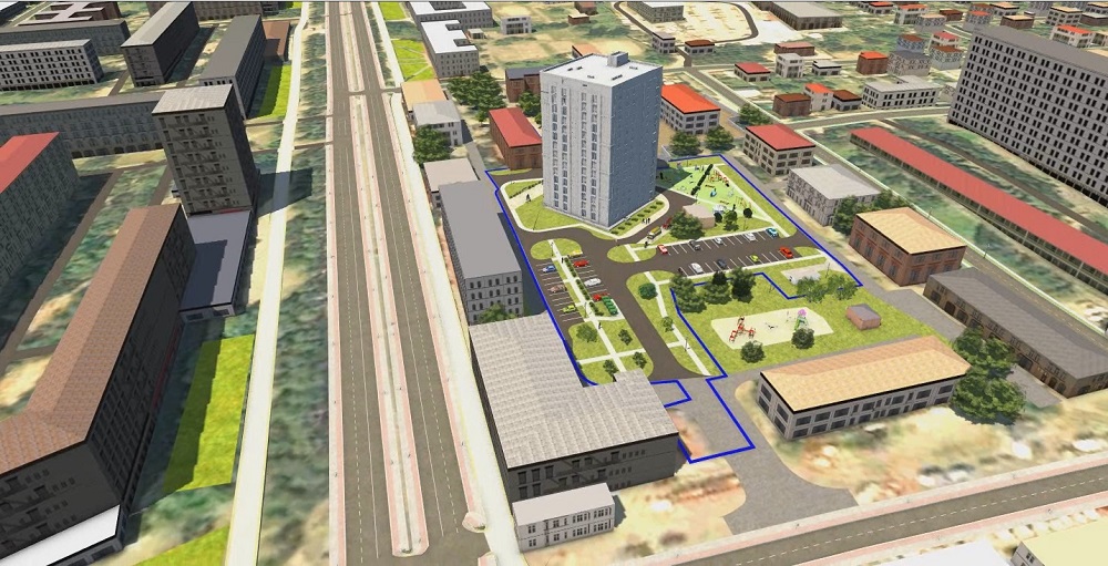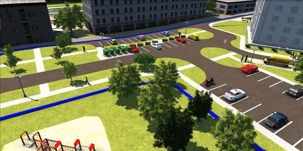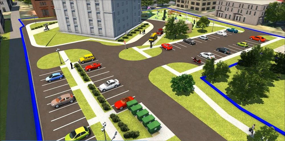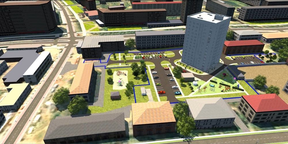 Парковка, пешеходные дорожки, у входа в жилую секцию скамьи, урны, велопарковки. Для игр детей во дворе предусмотрена игровая и спортивная площадки. Детская площадка отделена от проезда металлическим ограждением. Озеленение территории предусмотрено декоративными кустарниками, лиственными деревьями и устройством газона.