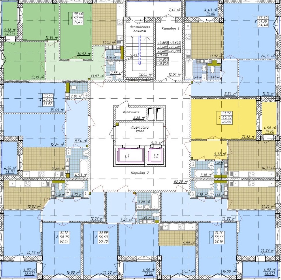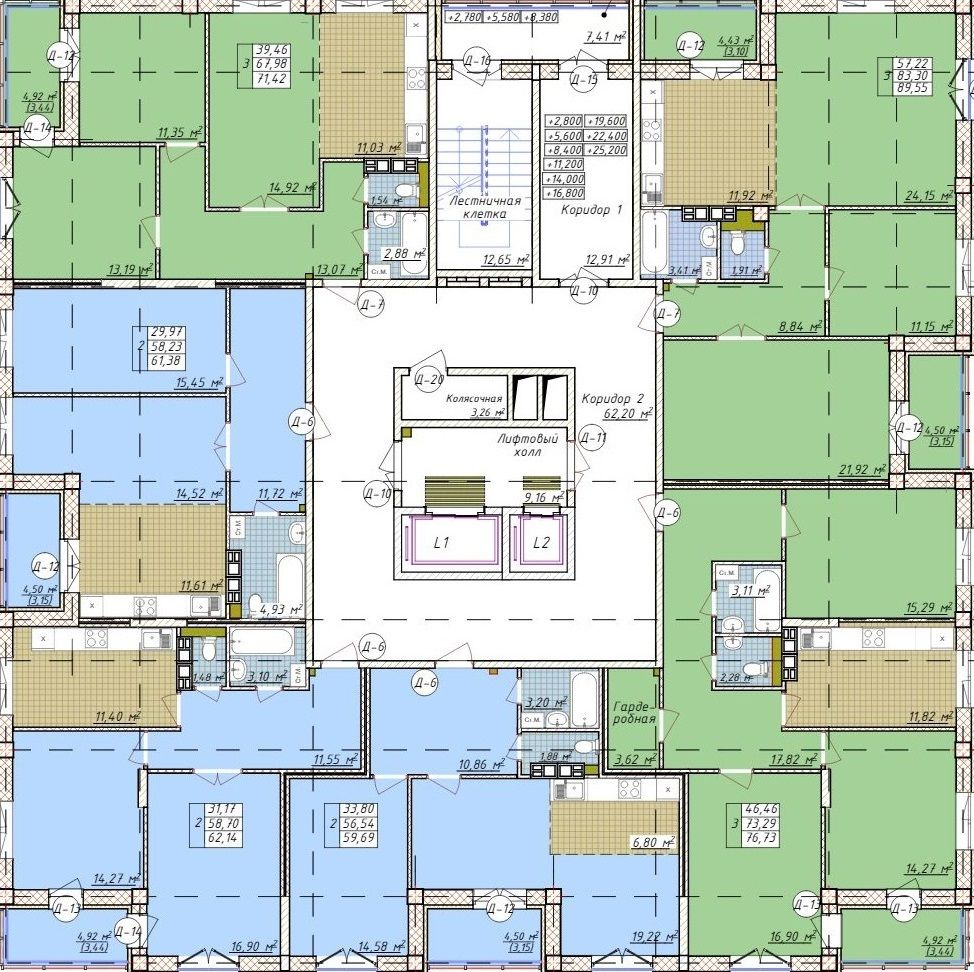 Метраж 58,60 кв.м., 61,38 кв.м., 63,95 кв.м., 62,19 кв.м. Свободные этажи – 1, 2, 6, 7, 14.
